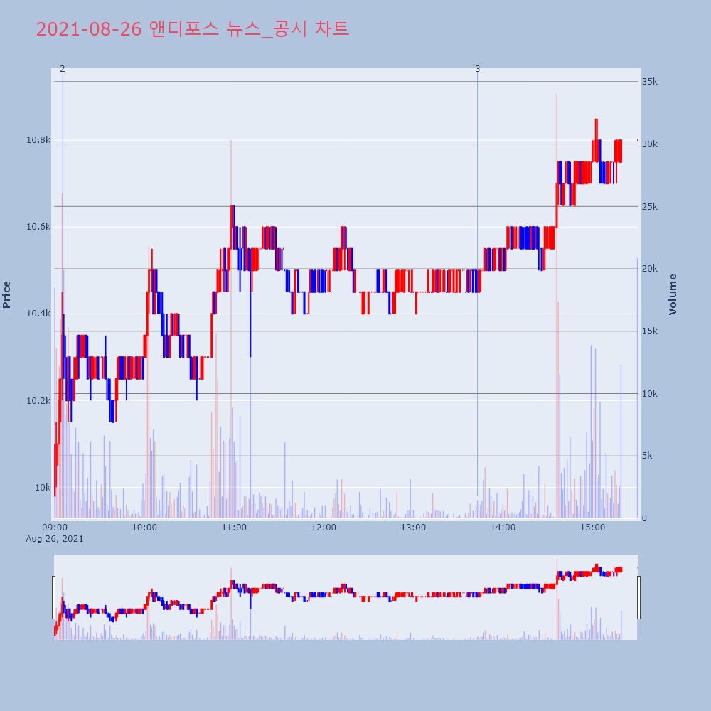 | 3 | [특징주]앤디포스, 액면병합 후 첫 거래일 급등 | 이데일리 | 2021.07.15 09:20 |