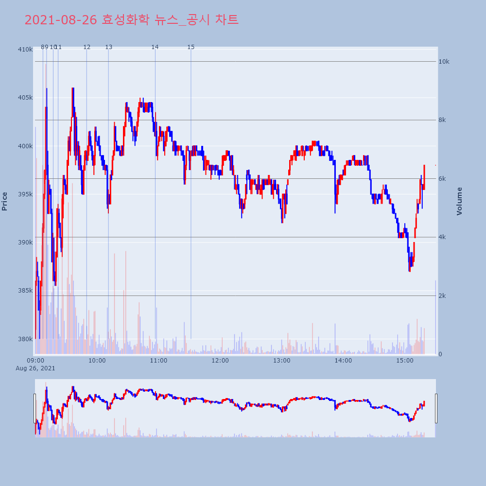| 15 | [장중수급포착] 효성화학, 외국인/기관 동시 순매수… 주가 +11.59% [서울=뉴스핌] 로보뉴스 = 26일 11시 30분 현재 | 뉴스핌 | 효성화학 | 2021-08-26 11:31:33 |