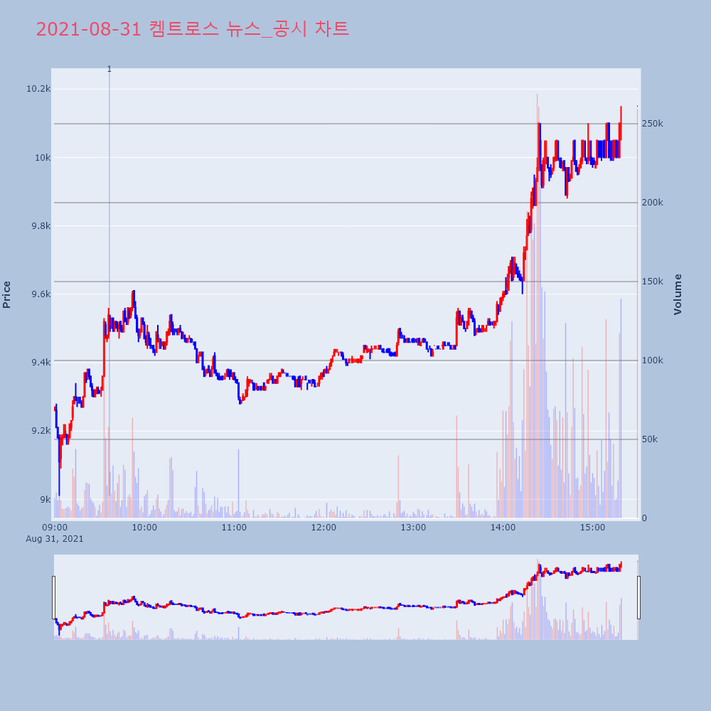 | 10 | [특징주] 켐트로스, 리튬이온 2차전지 품질 향상 특허 소식에 급등 | 매일경제 | 2020.10.07 09:41 |