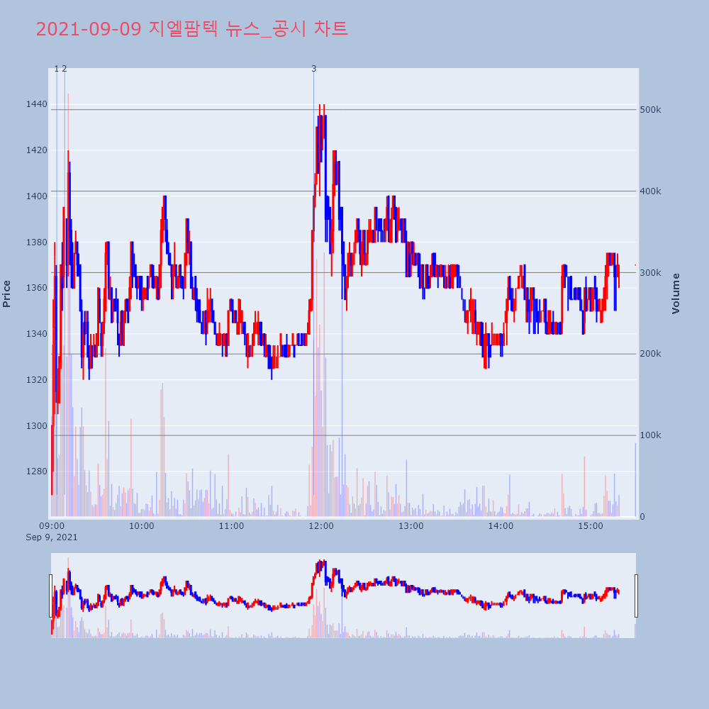 | 2 | 지엘팜텍, +15.29% VI 발동지엘팜텍(204840)이 VI가 발동했다. 전일 대비 | 조선경제 | 지엘팜텍 | 2021-09-09 09:08:37 |