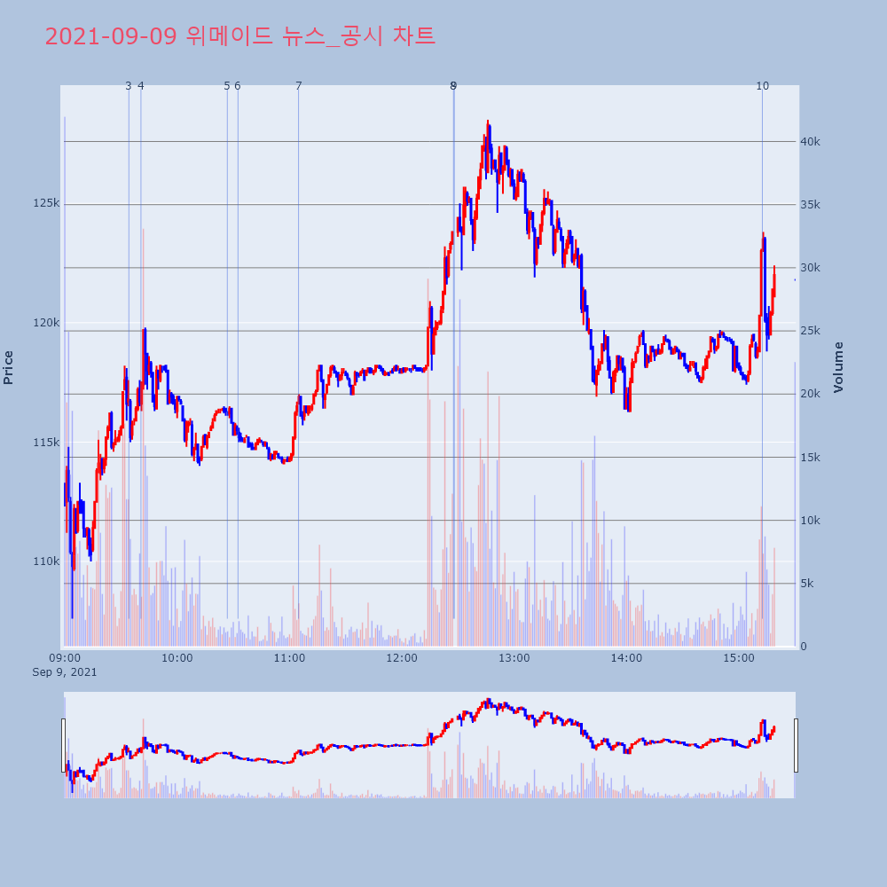 | 1 | 위메이드, -11.73% VI 발동위메이드(112040)가 VI가 발동했다. 전일 대비 | 조선경제 | 위메이드 | 2021-09-08 15:03:39 |