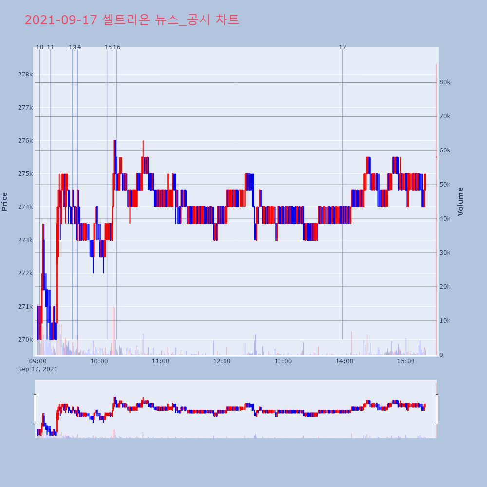 | 16 | [장중수급포착] 셀트리온, 외국인/기관 동시 순매수… 주가 +3.00% [서울=뉴스핌] 로보뉴스 = 17일 10시 15분 현재 | 뉴스핌 | 셀트리온 | 2021-09-17 10:17:14 |
