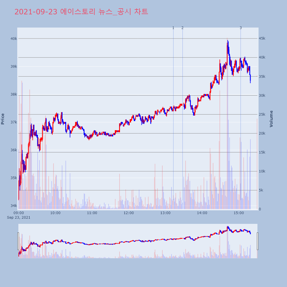 2 | 에이스토리, +10.57% VI 발동에이스토리(241840)가 VI가 발동했다. 전일 대비 | 조선경제 | 에이스토리 | 2021-09-23 13:28:10 |