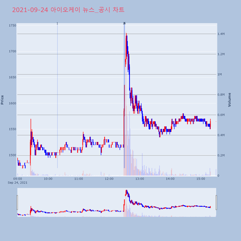 | 5 | 아이오케이, +11.22% VI 발동아이오케이(078860)가 VI가 발동했다. 전일 대비 | 조선경제 | 아이오케이 | 2021-09-24 12:30:44 |