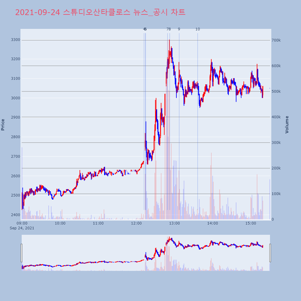 | 4 | 스튜디오산타클로스, +0.94% VI 발동스튜디오산타클로스(204630)가 VI가 발동했다. 전 | 조선경제 | 스튜디오산타클로스 | 2021-09-24 12:12:08 |