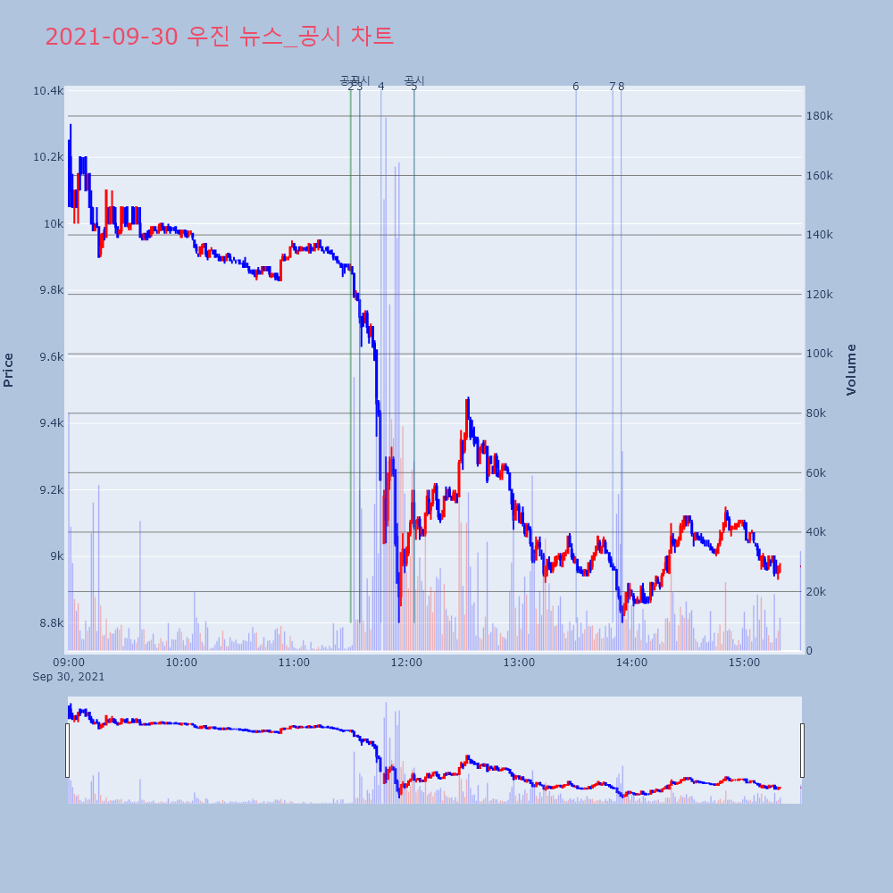 4 | 우진, -9.06% VI 발동우진(105840)이 VI가 발동했다. 전일 대비 9. | 조선경제 | 우진 | 2021-09-30 11:46:27 |