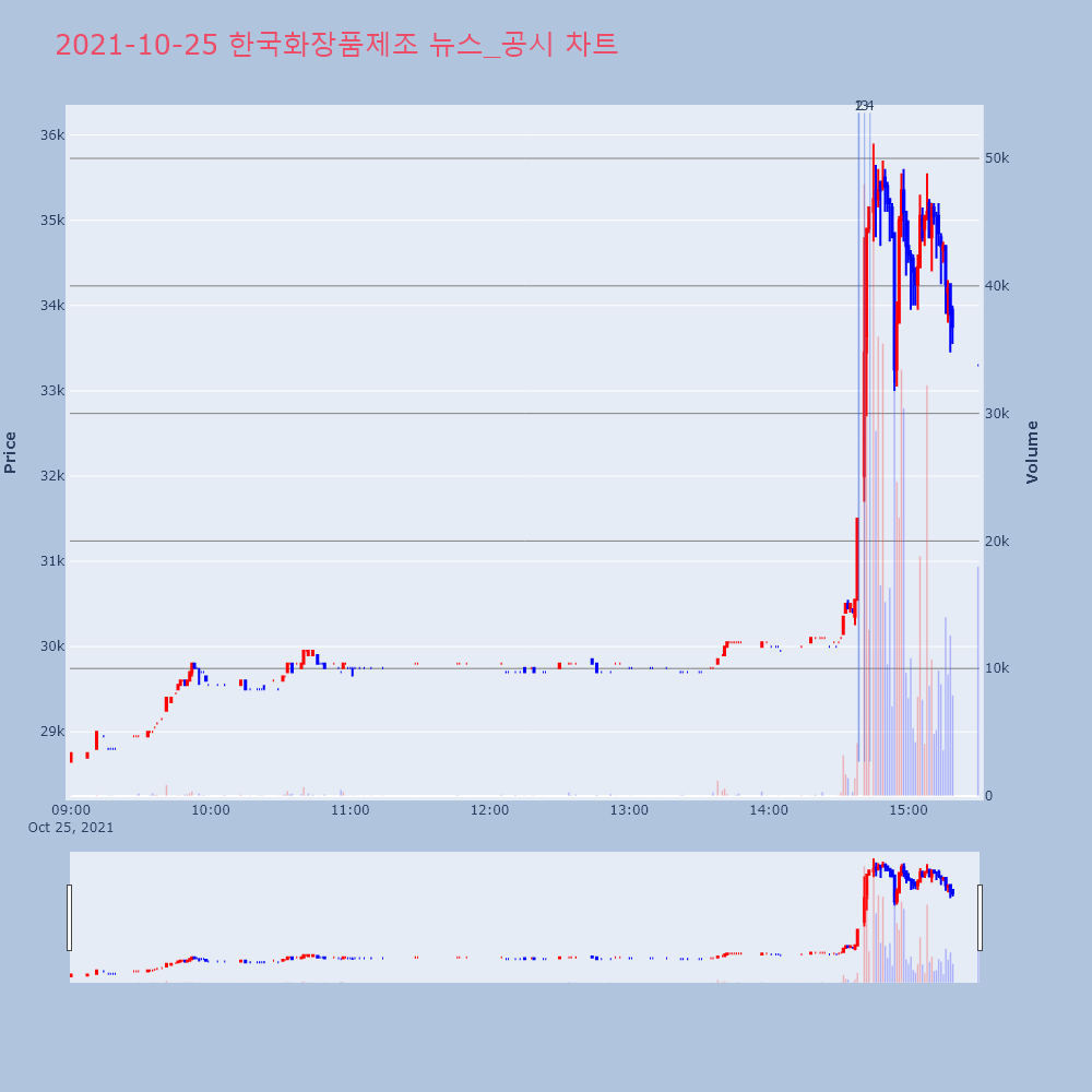 | 2 | 한국화장품제조, +9.00% VI 발동한국화장품제조(003350)가 VI가 발동했다. 전일 | 조선경제 | 한국화장품제조 | 2021-10-25 14:38:48 |