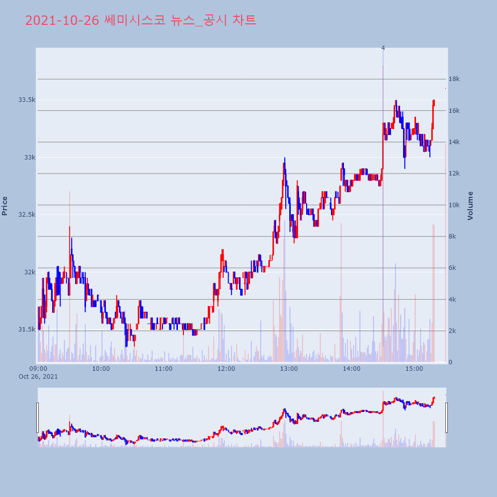 4 | 쎄미시스코(136510) 소폭 상승세 +4.92% 제목 : 쎄미시스코(136510)소폭 상승세 +4.92 | 인포스탁 | 쎄미시스코 | 2021-10-26 14:30:12 |