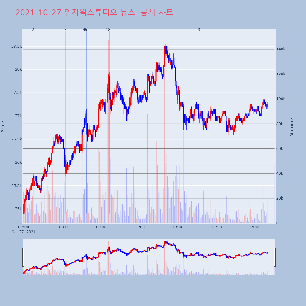 7 | 위지윅스튜디오, +9.84% VI 발동위지윅스튜디오(299900)가 VI가 발동했다. 전일 | 조선경제 | 위지윅스튜디오 | 2021-10-27 11:08:19 |