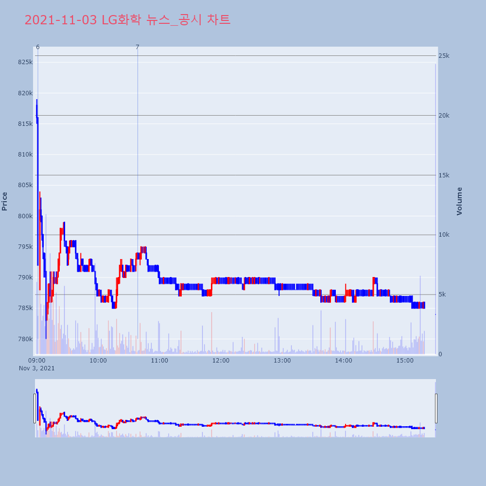 | 6 | LG화학, -4.57% VI 발동LG화학(051910)이 VI가 발동했다. 전일 대비 | 조선경제 | LG화학 | 2021-11-03 09:01:04 |