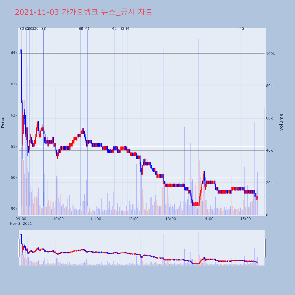| 45 | [특징주] 카카오뱅크, 3분기 실적 기대치 못 미치자 7% 넘게 하락3일 카카오뱅크(323410) 주가가 고전하고 있다. | 조선경제 | 카카오뱅크 | 2021-11-03 14:54:00 |