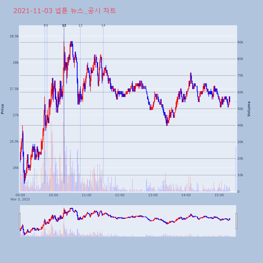| 12 | [강세 토픽] 크래프톤 관련주 테마, 넵튠 +8.67%, 넷게임즈 +5.68%[크래프톤 관련주] 테마가 강세다. 전일 대비 2.64 | 조선경제 | 넵튠 | 2021-11-03 10:19:33 |