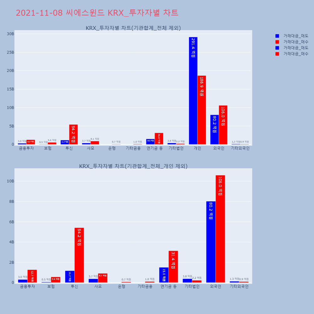 | 투자기관 | 거래량_매도 | 거래량_매수 | 거래량_순매수 | 거래대금_매도 | 거래대금_매수 | 거래대금_순매수 |
