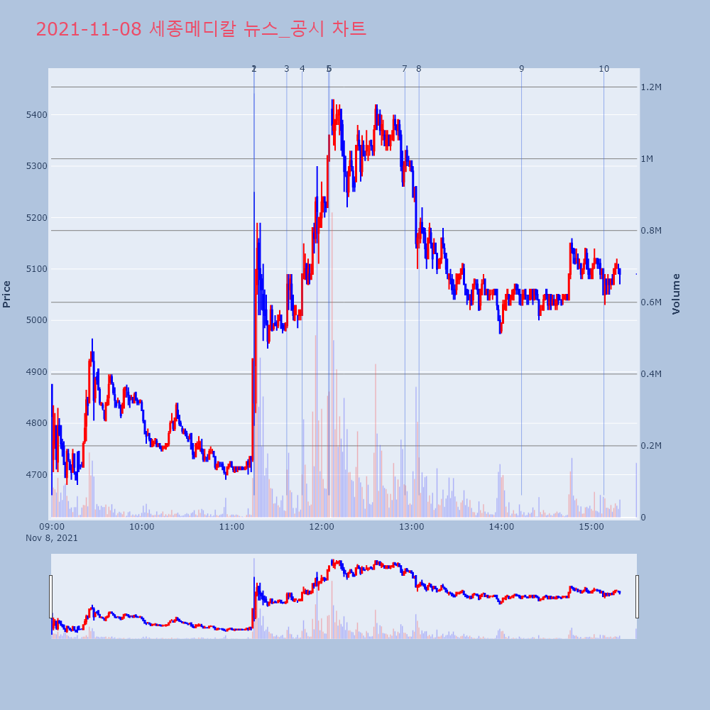 | 6 | 세종메디칼, +9.50% VI 발동세종메디칼(258830)이 VI가 발동했다. 전일 대비 | 조선경제 | 세종메디칼 | 2021-11-08 12:05:12 |