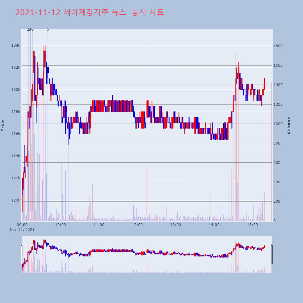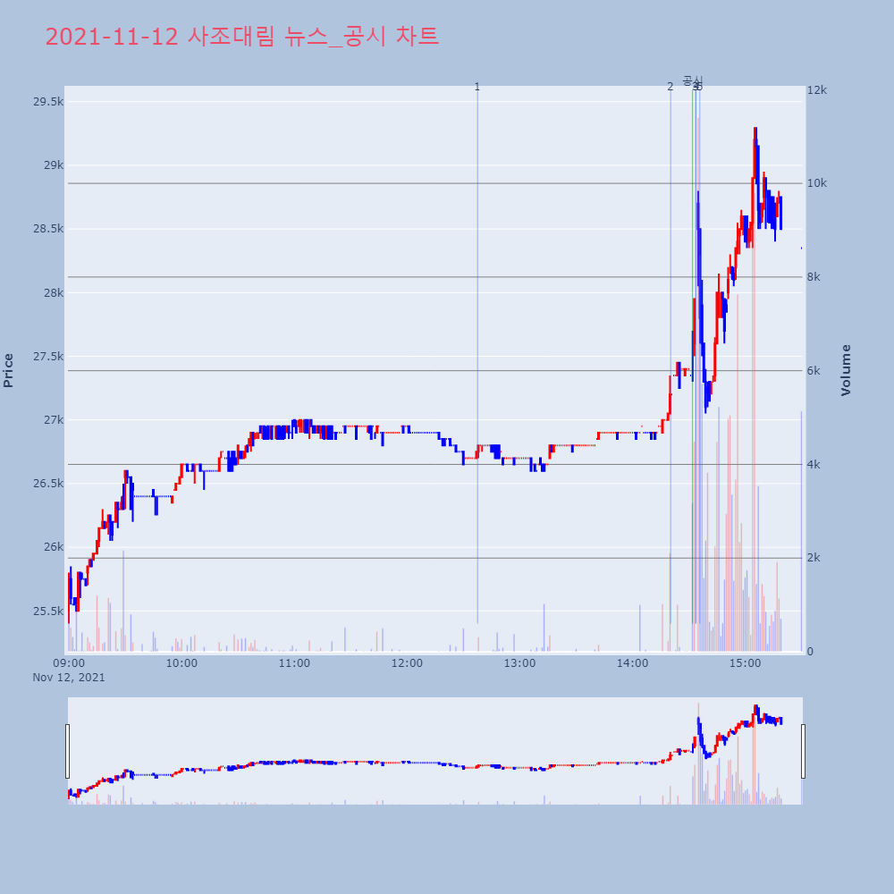 | 4 | 사조대림, +8.38% VI 발동사조대림(003960)이 VI가 발동했다. 전일 대비 | 조선경제 | 사조대림 | 2021-11-12 14:33:51 |