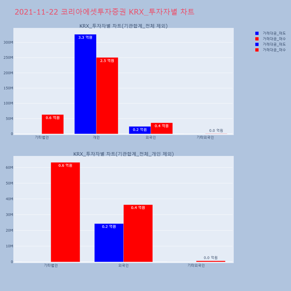| 투자기관 | 거래량_매도 | 거래량_매수 | 거래량_순매수 | 거래대금_매도 | 거래대금_매수 | 거래대금_순매수 |
