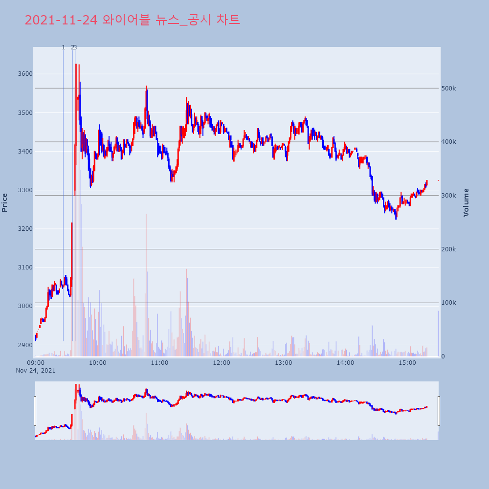 2 | 와이어블, +10.86% VI 발동와이어블(065530)이 VI가 발동했다. 전일 대비 | 조선경제 | 와이어블 | 2021-11-24 09:35:46 |