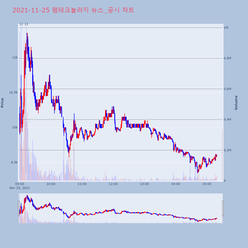 | 13 | 램테크놀러지, +16.30% VI 발동램테크놀러지(171010)가 VI가 발동했다. 전일 대 | 조선경제 | 램테크놀러지 | 2021-11-25 09:12:38 |
