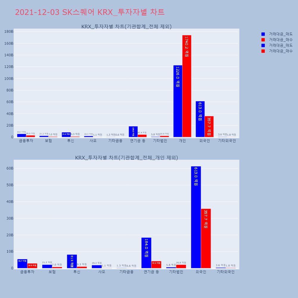 | 투자기관 | 거래량_매도 | 거래량_매수 | 거래량_순매수 | 거래대금_매도 | 거래대금_매수 | 거래대금_순매수 |