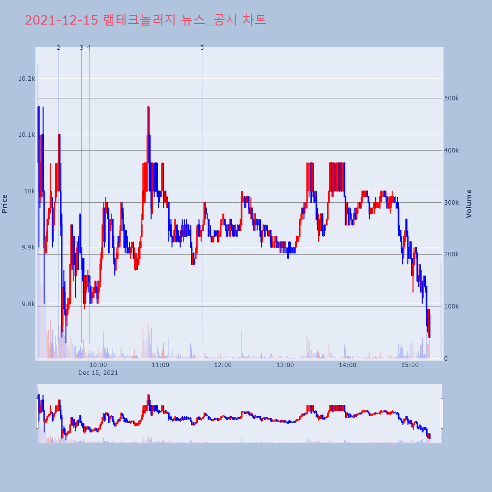 | 6 | [특징주] 램테크놀러지, '공장 설립 불허' 결정 유지에 급락[특징주] 램테크놀러지, '공장 설립 불허' 결정 유지 | 연합뉴스 | 램테크놀러지 | 2021-12-15 16:03:25 |