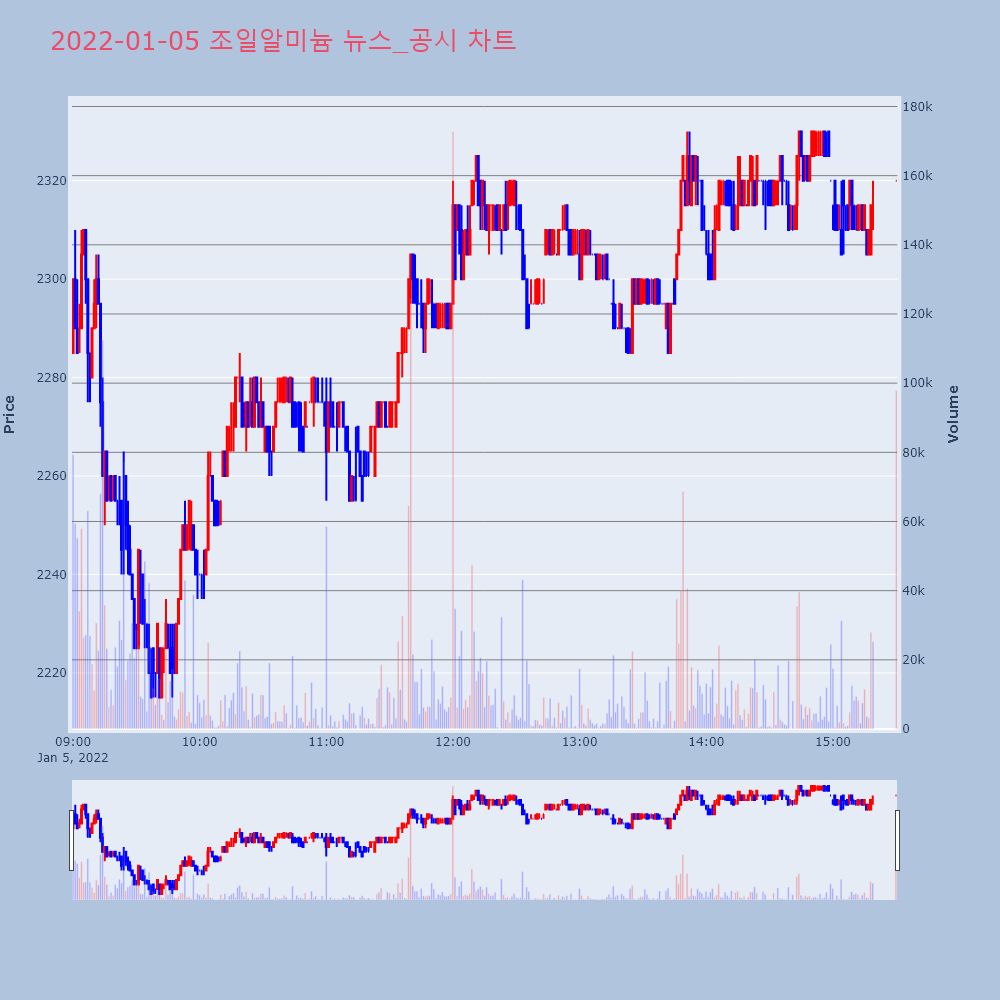 | 3 | 조일알미늄, 1,595억원 규모 공급계약(2차전지 양극박 소재) 체결 제목 : 조일알미늄, 1,595억원 규모 공급계약(2차 | 인포스탁 | 조일알미늄 | 2022-01-05 16:10:47 |