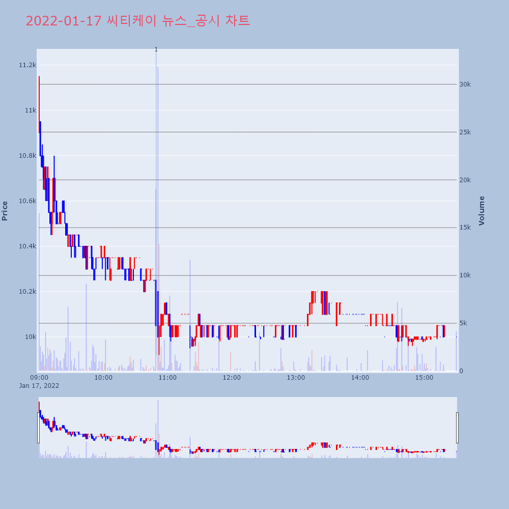 1 | 씨티케이, -8.97% VI 발동씨티케이(260930)가 VI가 발동했다. 전일 대비 | 조선경제 | 씨티케이 | 2022-01-17 10:49:22 |