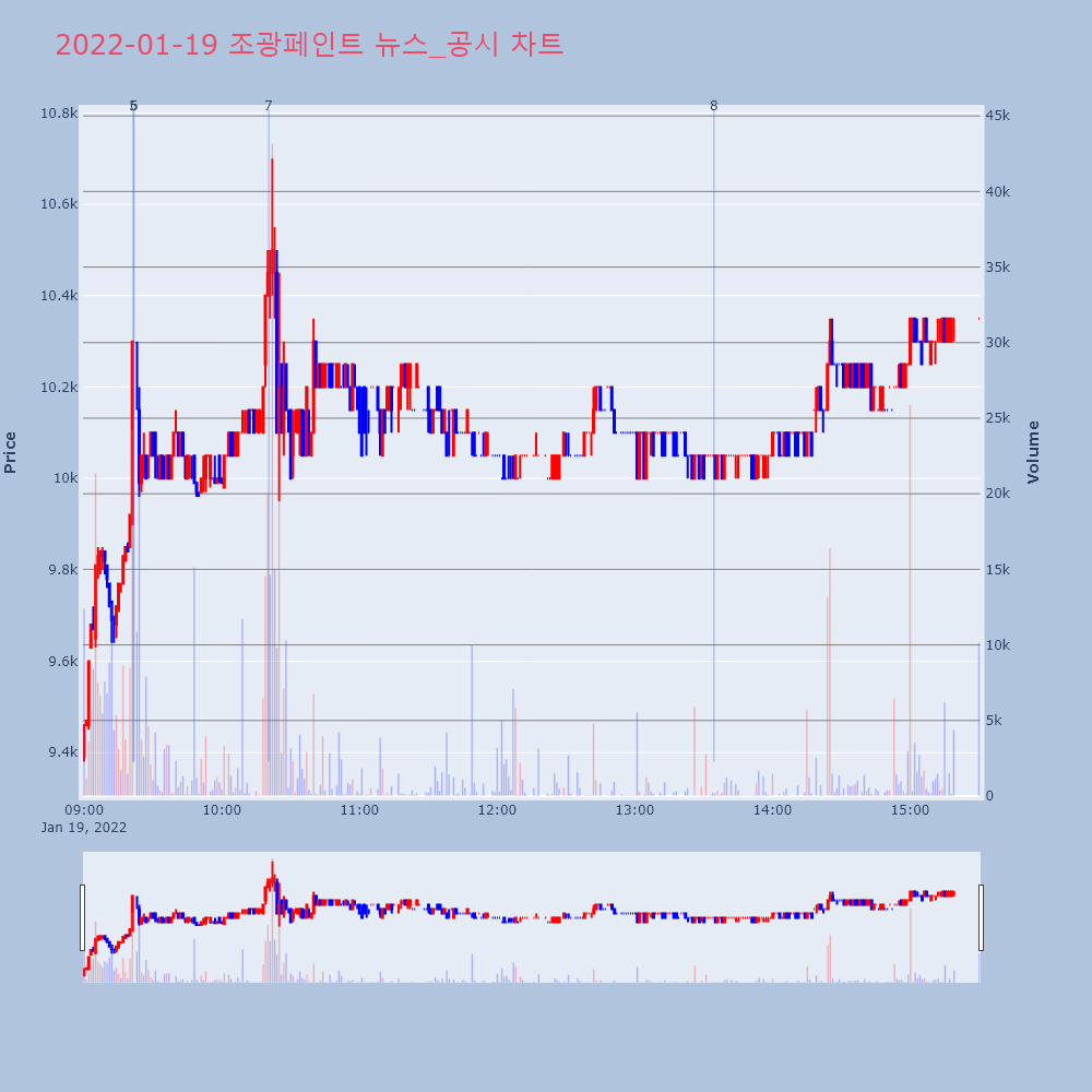 | 6 | 조광페인트, +9.69% VI 발동조광페인트(004910)가 VI가 발동했다. 전일 대비 | 조선경제 | 조광페인트 | 2022-01-19 09:21:45 |