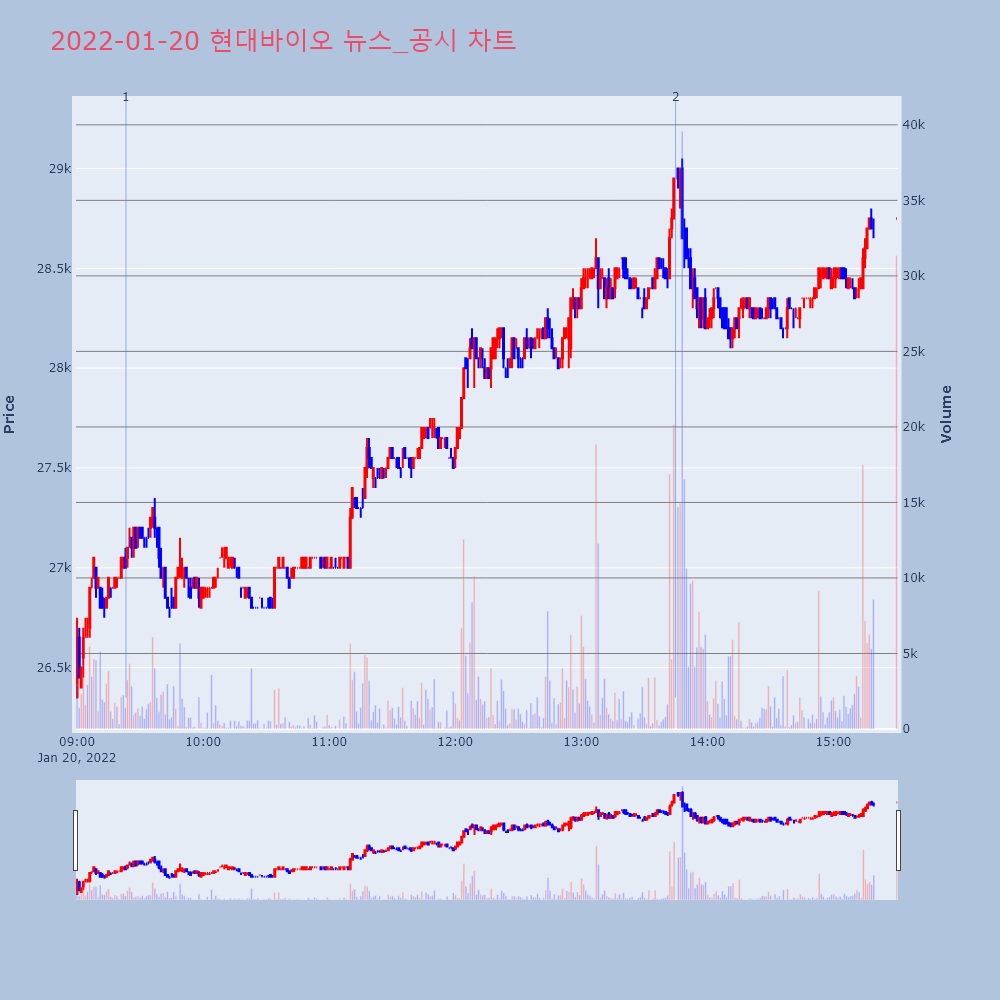 | 2 | 현대바이오, +10.08% VI 발동현대바이오(048410)가 VI가 발동했다. 전일 대비 | 조선경제 | 현대바이오 | 2022-01-20 13:44:51 |