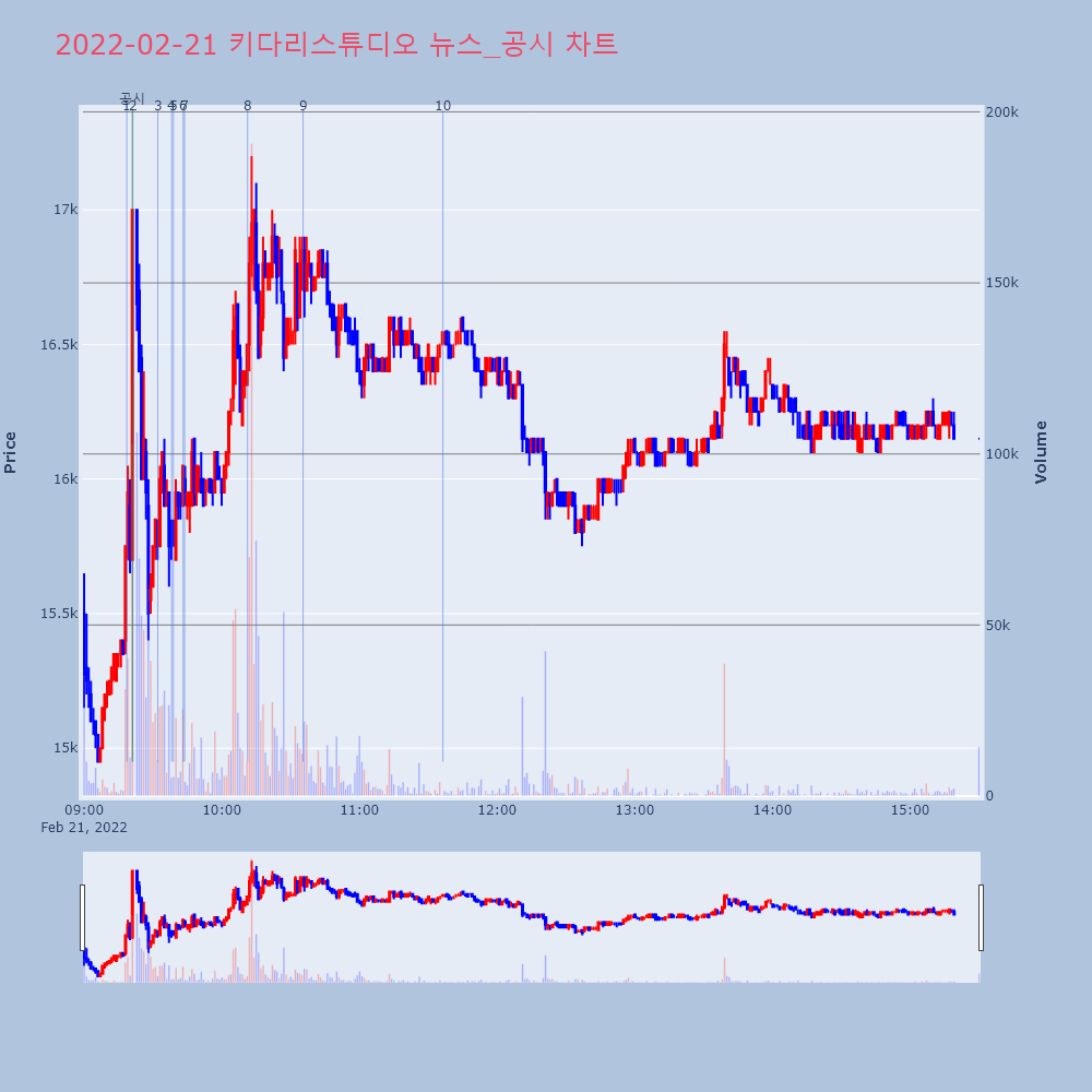 | 2 | 키다리스튜디오, +12.96% VI 발동키다리스튜디오(020120)가 VI가 발동했다. 전일 | 조선경제 | 키다리스튜디오 | 2022-02-21 09:21:14 |