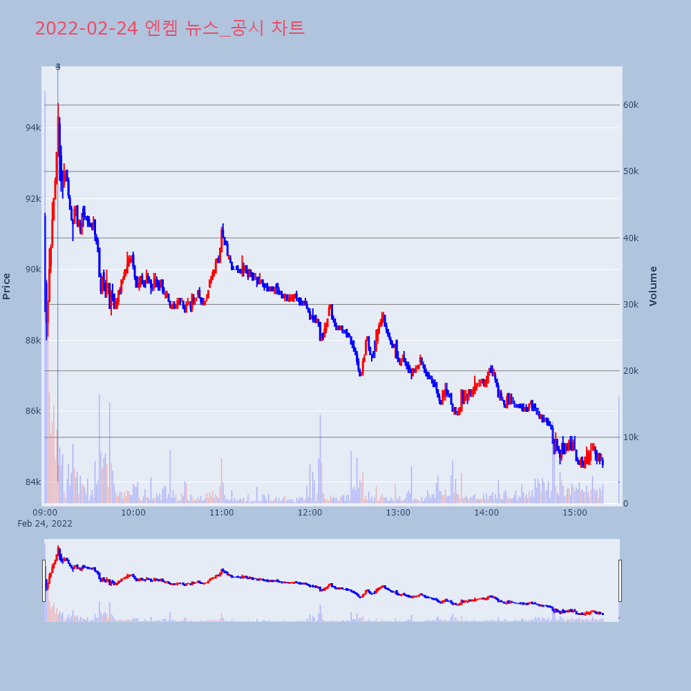 3 | [특징주] 엔켐, 4분기 영업손실 254억원...적자전환 ‘하락’엔켐(348370) 주가가 하락하고 있다. 4분기 부진 | 조선경제 | 엔켐 | 2022-02-24 09:08:42 |