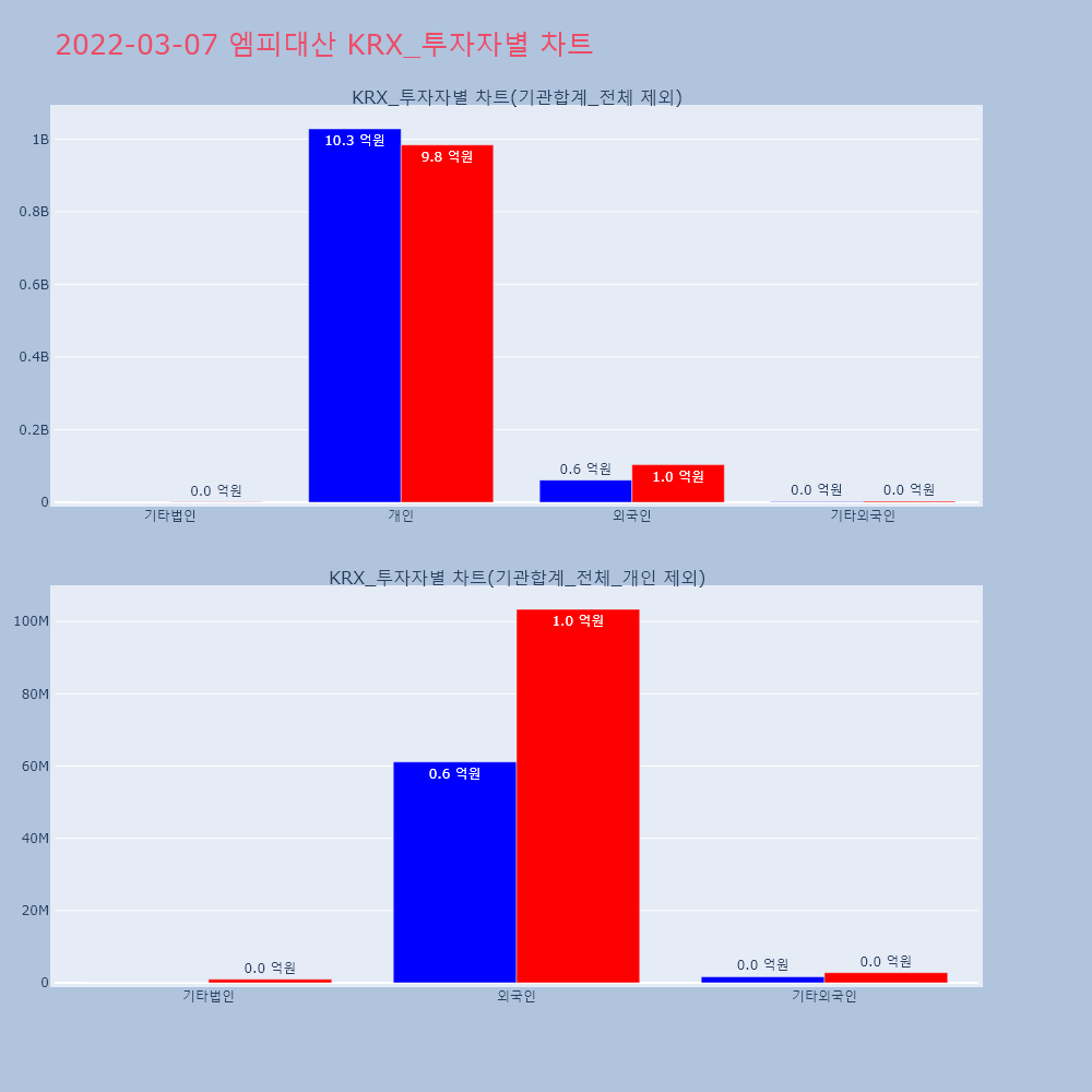 | 투자기관 | 거래량_매도 | 거래량_매수 | 거래량_순매수 | 거래대금_매도 | 거래대금_매수 | 거래대금_순매수 |