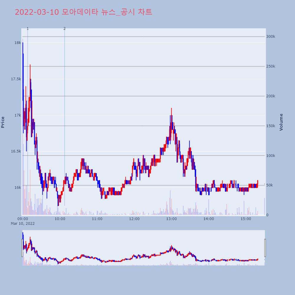 | 2 | [특징주] 모아데이타, 상장 첫날 '11%대' 약세… 공모가 하회 제목 : [특징주] 모아데이타, 상장 첫날 '11%대' | 인포스탁 | 모아데이타 | 2022-03-10 10:07:37 |