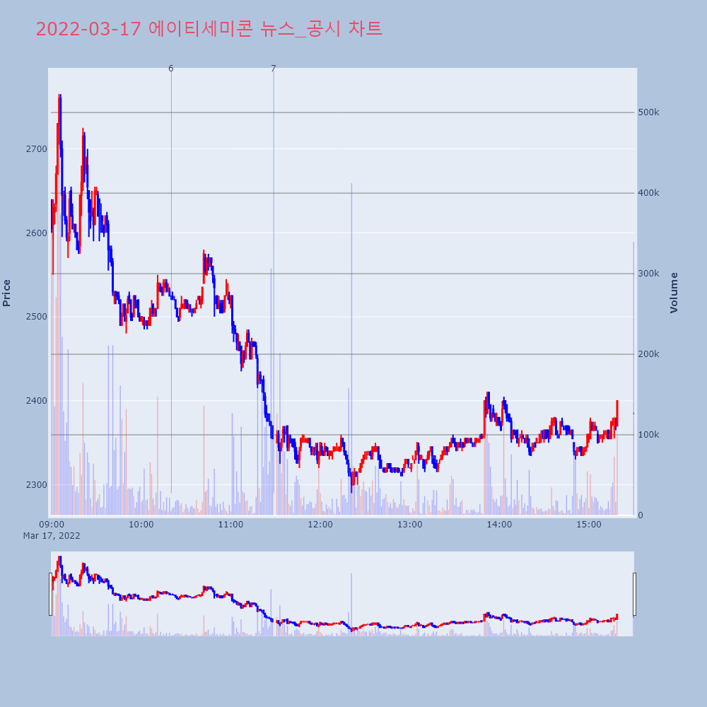 | 7 | 에이티세미콘, -12.27% VI 발동에이티세미콘(089530)이 VI가 발동했다. 전일 대 | 조선경제 | 에이티세미콘 | 2022-03-17 11:28:49 |