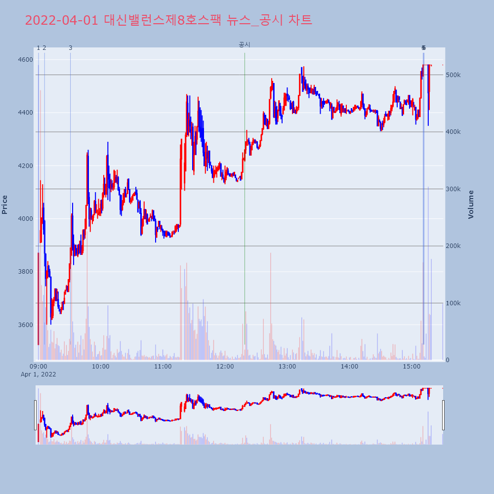 2 | 대신밸런스제8호스팩(336570) 거래재개 첫날 급등 +13.33% 제목 : 대신밸런스제8호스팩(336570)거래재개 첫날 | 인포스탁 | 대신밸런스제8호스팩 | 2022-04-01 09:05:56 |