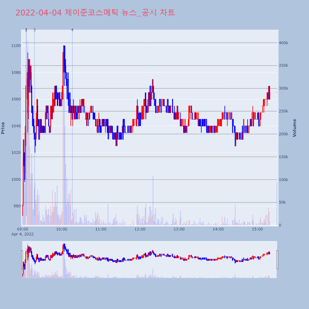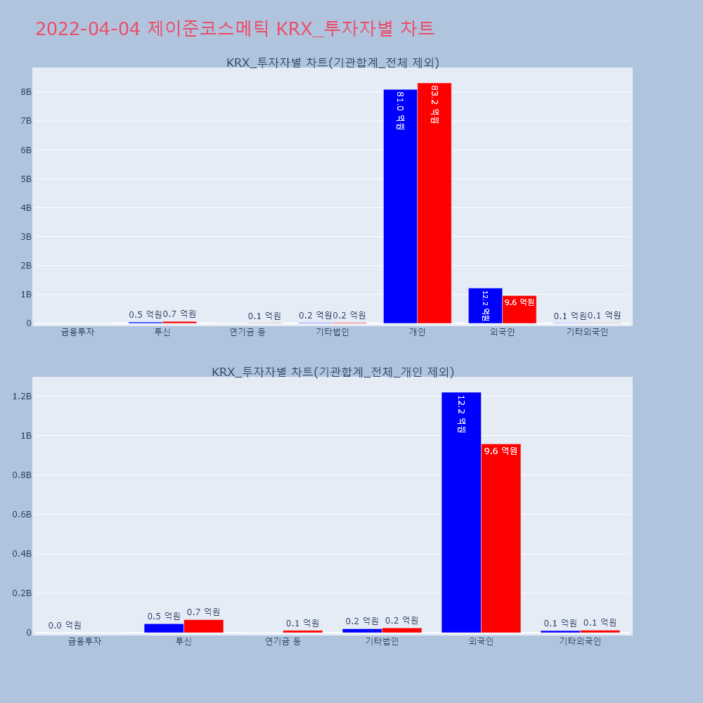 | 4 | [장중수급포착] 제이준코스메틱, 외국인 20.26만 주 대량 순매수... 주가 +[서울=뉴스핌] 로보뉴스 = 04일 10시 15분 현재 | 뉴스핌 | 제이준코스메틱 | 2022-04-04 10:16:23 |
