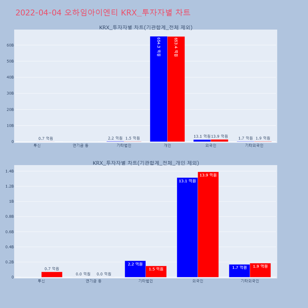 | 2 | 오하임아이엔티, +15.05% VI 발동오하임아이엔티(309930)가 VI가 발동했다. 전일 | 조선경제 | 오하임아이엔티 | 2022-04-04 09:46:41 |