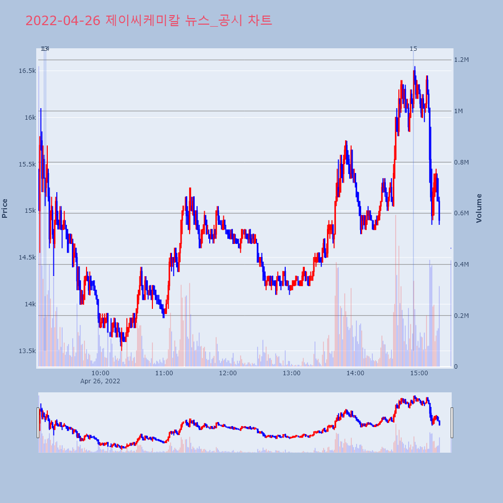 | 14 | '제이씨케미칼' 52주 신고가 경신, 최근 3일간 기관 대량 순매수◆ 주체별 매매동향- 최근 3일간 기관 대량 순매수 | 한경/증권 | 제이씨케미칼 | 2022-04-26 09:08:38 |