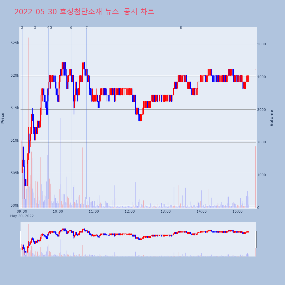 | 8 | [특징주] 효성첨단소재, 지속적 증설 추진·판가 개선 효과에 강세 제목 : [특징주] 효성첨단소재, 지속적 증설 추진·판 | 인포스탁 | 효성첨단소재 | 2022-05-30 13:25:47 |