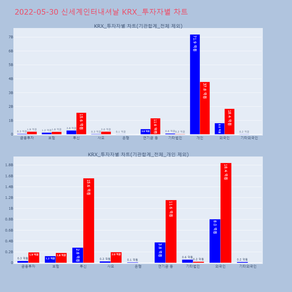 | 투자기관 | 거래량_매도 | 거래량_매수 | 거래량_순매수 | 거래대금_매도 | 거래대금_매수 | 거래대금_순매수 |