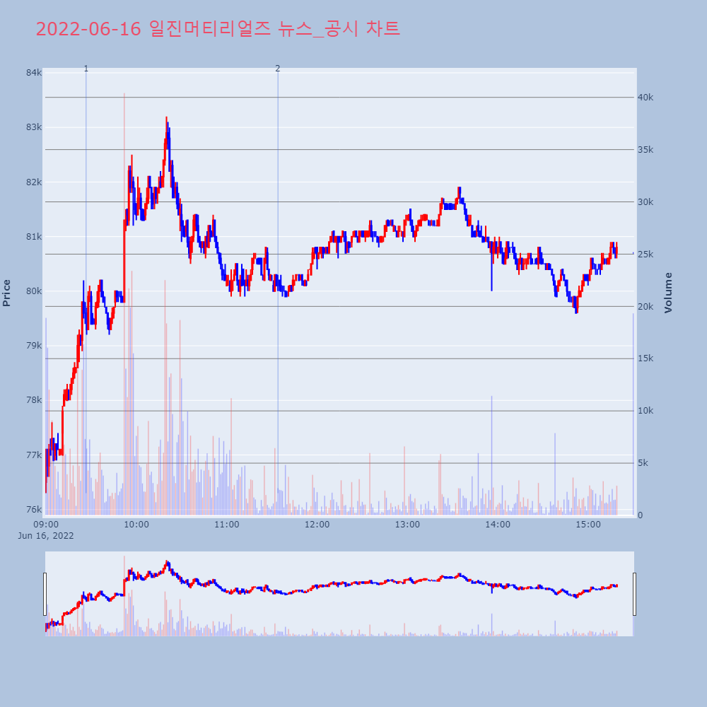 | 2 | [장중수급포착] 일진머티리얼즈, 외국인/기관 동시 순매수… 주가 +9.12% [서울=뉴스핌] 로보뉴스 = 16일 11시 30분 현재 | 뉴스핌 | 일진머티리얼즈 | 2022-06-16 11:34:02 |