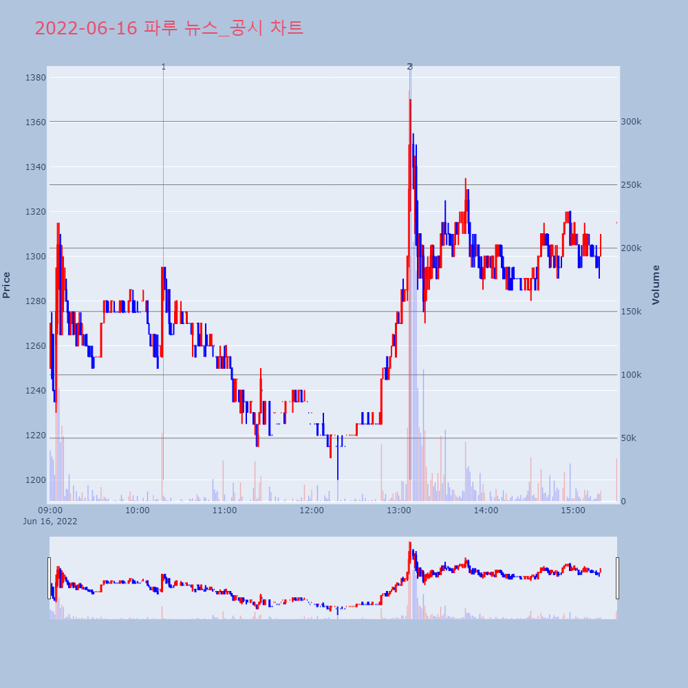 | 3 | 파루, +14.64% VI 발동파루(043200)가 VI가 발동했다. 전일 대비 14 | 조선경제 | 파루 | 2022-06-16 13:08:26 |