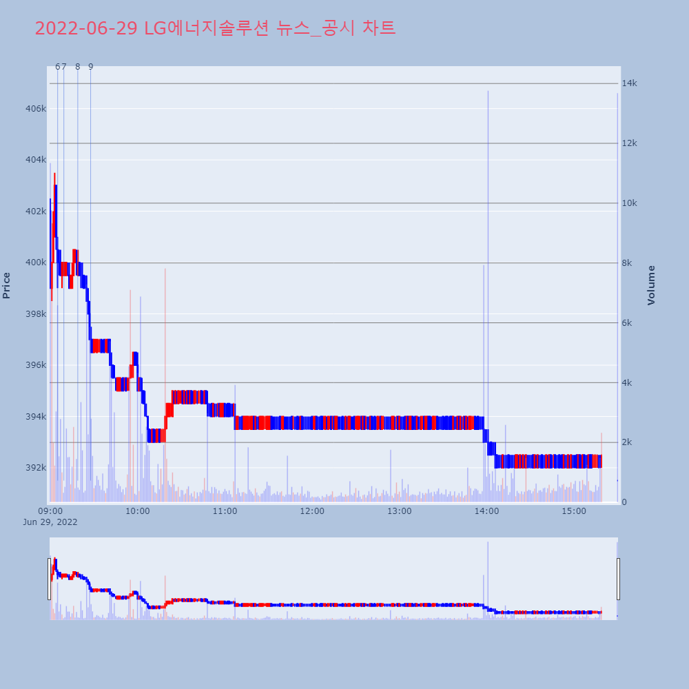 | 7 | [특징주]LG에너지솔루션, 美 투자계획 재검토…40만원 기로▶ 하이스탁론, 선취수수료 없는 월 0.2%대 최저금리 | 이데일리 | LG에너지솔루션 | 2022-06-29 09:09:18 |
