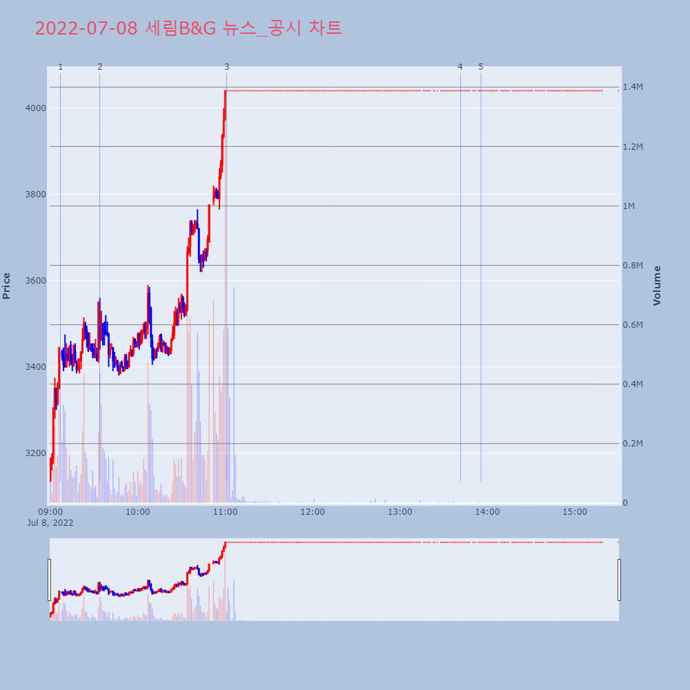 | 3 | [이시각 상한가] 세림B&G(▲930) - 8일 오전 11시[이투데이/e2BOT 기자(e2bot@etoday.co | 이투데이 | 세림B&G | 2022-07-08 11:01:03 |