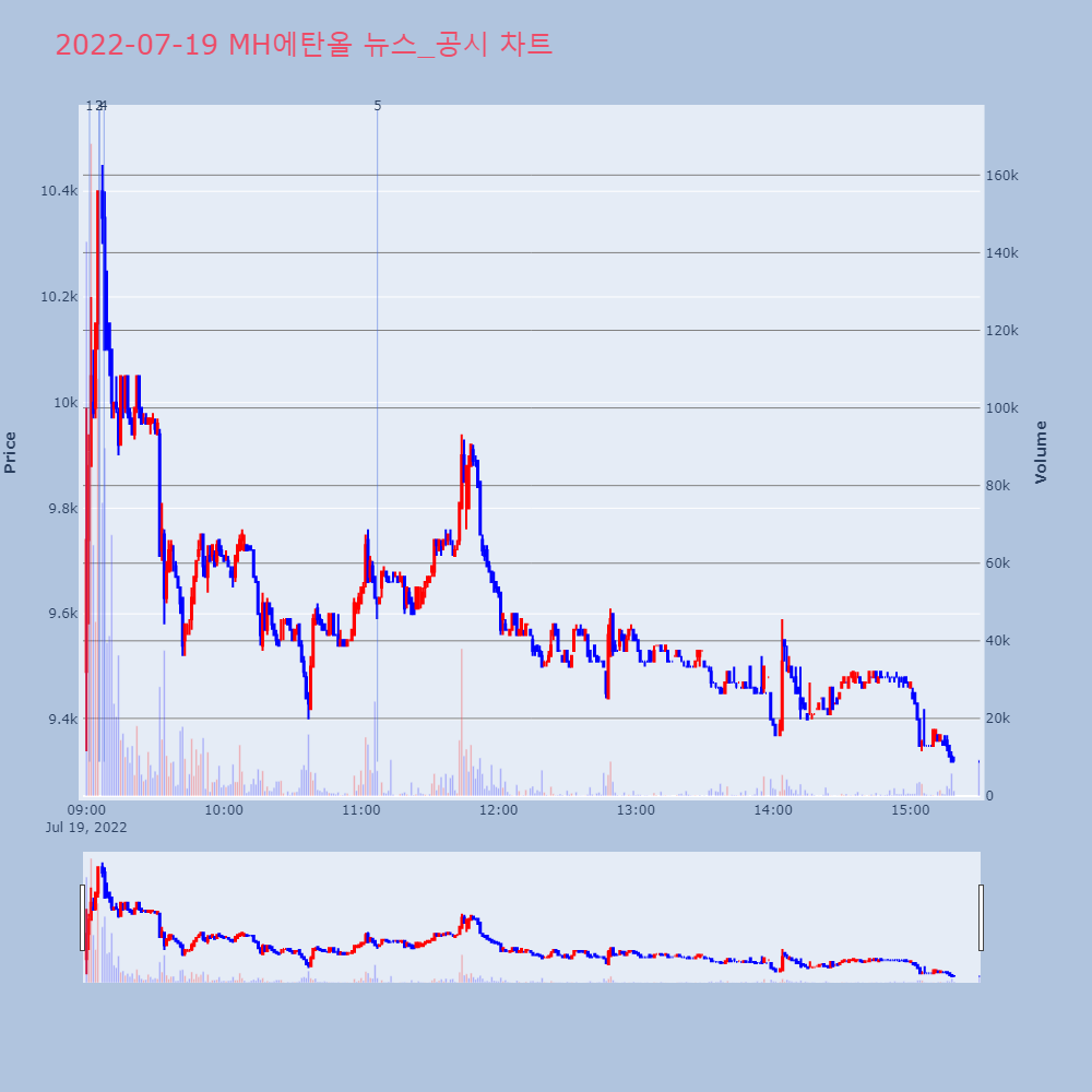| 5 | [거래량 상위종목] MH에탄올, 거래량 전일비 1130.75%↑…2위 무학[버핏연구소=김미래 기자] 19일 오전 10시 47분 | 버핏연구소 | MH에탄올 | 2022-07-19 11:07:10 |