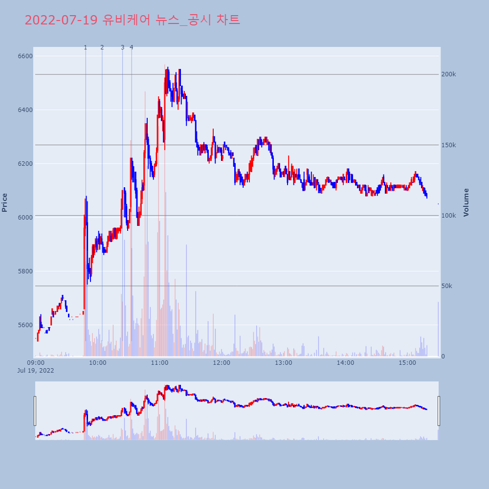 | 3 | 유비케어, +9.91% VI 발동유비케어(032620)가 VI가 발동했다. 전일 대비 | 조선경제 | 유비케어 | 2022-07-19 10:24:09 |