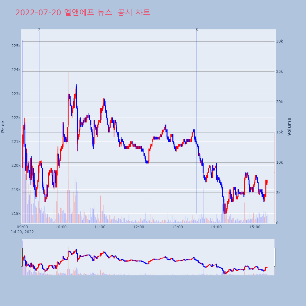 | 8 | [특징주] 엘앤에프, 2분기 호실적·양극재 판가 상승 전망에 ↑ 제목 : [특징주] 엘앤에프, 2분기 호실적·양극재 판 | 인포스탁 | 엘앤에프 | 2022-07-20 13:29:51 |