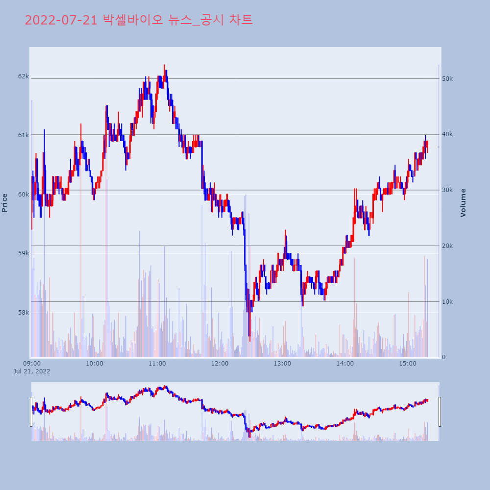 | 1 | [특징주] 박셀바이오, 간암 치료제 임상 순항 소식에 오름세박셀바이오가 장 초반 오름세다.20일 오전 9시 19 | 조선경제 | 박셀바이오 | 2022-07-20 09:24:20 |