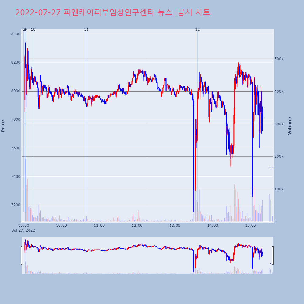 | 6 | 피엔케이피부임상연구센타, 0.00% VI 발동피엔케이피부임상연구센타(347740)가 VI가 발동했다 | 조선경제 | 피엔케이피부임상연구센타 | 2022-07-27 09:00:11 |