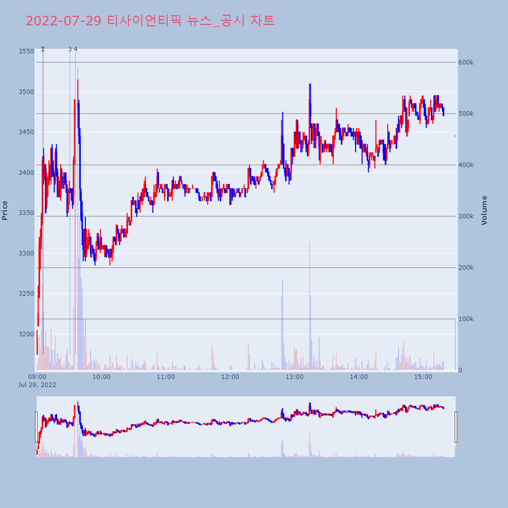 | 4 | 티사이언티픽, +10.44% VI 발동티사이언티픽(057680)이 VI가 발동했다. 전일 대 | 조선경제 | 티사이언티픽 | 2022-07-29 09:35:49 |