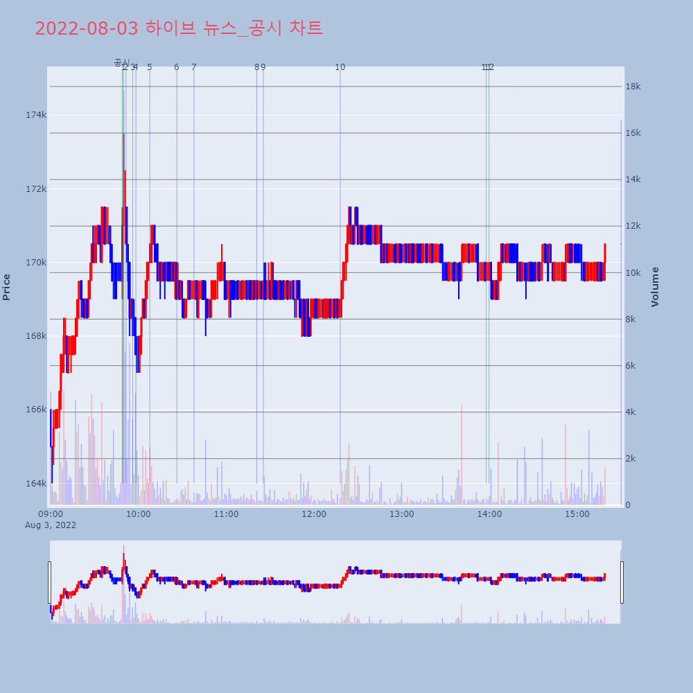 | 7 | [특징주] 하이브, 2분기 영업익 215% 급증 소식에 강세 제목 : [특징주] 하이브, 2분기 영업익 215% 급 | 인포스탁 | 하이브 | 2022-08-03 10:38:01 |